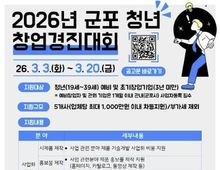 [경기탑뉴스=박봉석 기자] 군포산업진흥원은 지역 내 유망 청년 창업가를 발굴하고 혁신 아이디어의 성공적인 사업화를 지원하기 위해 2026년 군포 청년 창업경진대회 지원사업 참가자를 2026년 3월 3일부터 3월 20일까지 모집한다고 밝혔다. 이번 사업은 창의적인 아이디어와 기술력을 보유한 청년 예비창업자 및 초기 창업기업을 대상으로 우수 창업 아이템을 발굴하고, 단계별 맞춤 지원을 통해 안정적인 시장 진입과 지속 가능한 성장을 돕기 위해 마련됐다. 특히 경진대회를 통해 선발된 우수팀에게는 최대 1천만 원의 사업화 지원금과 전문가 멘토링 등 실질적인 성장 지원 프로그램이 제공될 예정이다. 또한 향후 창업보육센터 입주 신청 시 우대 혜택을 부여해 후속 성장까지 연계 지원할 계획이다. 군포산업진흥원은 이번 사업을 통해 청년 창업 활성화 기반을 더욱 강화하고, 지역 내 창업 생태계 선순환 구조를 구축해 나간다는 방침이다. 아울러 우수 창업기업이 관내에 안정적으로 정착해 지속적으로 성장할 수 있도록 맞춤형 지원을 확대해 나갈 예정이다. 유병직 원장은 “청년 창업은 지역 경제의 미래 성장 동력”이라며, “이