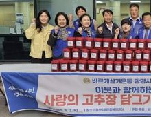 [경기탑뉴스=박봉석 기자] 광명시 철산3동 바르게살기위원회는 지난 13일 철산3동 행정복지센터 앞마당에서 ‘사랑의 고추장 나눔 행사’를 개최했다. 이날 행사는 위원회 회원들이 직접 담근 고추장을 관내 독거어르신과 저소득 가정 등 취약계층 50가구에 전달했다. 김계출 위원장은 “정성을 담아 만든 고추장 한 통이 이웃의 밥상에 작은 온기를 더하길 바란다”며 “앞으로도 지역사회를 위한 나눔 활동에 적극 동참하겠다”고 말했다. 손영만 동장은 “좋은 재료로 정성껏 만든 고추장을 어려운 이웃에게 전달하게 돼 매우 뜻깊다”며 “이번 나눔이 더불어 사는 따뜻한 지역공동체를 만들어가는 데 큰 힘이 될 것”이라고 말했다.