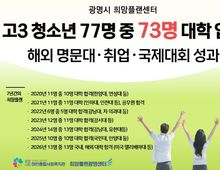 [경기탑뉴스=박봉석 기자] 광명시가 지원하는 희망플랜광명센터가 지난 7년간 청소년·청년 맞춤형 진로·자립 지원으로 의미 있는 성과를 이어가고 있다고 22일 밝혔다. 광명시립 하안종합사회복지관이 운영하는 희망플랜광명센터는 가정의 경제·사회적 여건으로 진로 준비에 어려움을 겪는 청소년과 청년을 대상으로 장기적이고 체계적인 지원을 지속해 왔다. 그 결과 지난해 희망플랜광명센터에서 활동하는 고등학교 3학년 청소년 77명 가운데 73명이 대학에 합격했으며, 취업 성공과 전문 분야 진출, 국제대회 입상 등 다양한 성과도 나타났다. 센터는 2019년부터 청소년 자립 지원을 핵심 과제로 삼아 안정적인 운영 기반을 마련해 왔다. 이에 따라 14세부터 24세까지 성장 단계에 맞춰 학업·진로·정서·자립을 아우르는 장기 지원 체계를 구축했다. 진로동기 강화, 맞춤형 컨설팅, 개별 멘토링, 가족 성장 지원 프로그램 등을 운영하며 청소년과 가족이 스스로 미래를 설계하도록 돕고 있다. 특히 올해에는 한부모 가정의 자녀인 류 모 자매 청소년이 미국 앨라배마 대학교 간호학과에 장학생으로 나란히 합격했다. 두 자매는