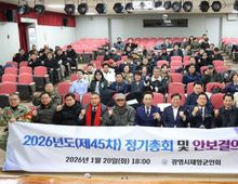 [경기탑뉴스=박봉석 기자] 광명시 재향군인회가 안보의식 함양과 향군회원 간 결속 강화를 위한 ‘2026년 정기총회 및 안보결의대회’를 개최했다. 이번 행사는 지난 20일 열린시민청 2층 대강당에서 열렸으며, 1부 정기총회와 2부 기념행사 및 안보결의대회로 나뉘어 진행했다. 1부 정기총회에서는 광명시 재향군인회의 예·결산과 올해 사업계획을 심의하고 단체 운영 방향을 공유했다. 이어 열린 2부 기념행사 및 안보결의대회에는 박승원 광명시장을 비롯한 내외빈과 향군회원 약 150여 명이 참석한 가운데, 유공자 포상과 향군의 다짐, 축사 순으로 진행했다. 이철희 회장은 “한파로 매우 추운 날씨에도 불구하고 박승원 시장님을 비롯한 많은 내외빈과 향군회원 여러분께서 자리를 함께해줘 감사하다”며 “올해도 재향군인회의 단합과 발전을 위해 최선을 다하겠다”고 말했다. 박승원 광명시장은 “광명시가 안정적으로 발전하기 위해서는 국가안보가 우선돼야 한다”며 “시민의 단합이 국가 위기 대응의 힘이 되고, 이는 시민의 안전과 삶의 질 향상으로 이어진다. 그 길에 광명시 재향군인회가 앞장서 주길 바란다”고 말했다.