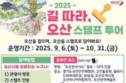 [경기탑뉴스=박봉석 기자] 오산시는 9월 6일부터 10월 31일까지 가을철 관람객을 맞이하기 위해 ‘길 따라, 오산’ 스탬프 투어를 운영한다고 밝혔다. 이번 투어는 오산시 주요 관광지와 역사·문화 자원을 탐방하며 지역의 매력을 체험할 수 있도록 기획됐으며, 온·오프라인 방식으로 진행된다. 특히 올해는 시민들의 적극적인 추천을 반영해 경기도 국민안전체험관과 오산 창작예술촌 등이 신규 투어 장소로 추가됐다. 또한 2025년에는 기존 GPS 및 온라인 웹 지도 기반 코스뿐만 아니라, 참여자가 직접 현장을 방문해 도장을 찍는 오프라인 코스도 함께 운영된다. 참여자들은 스마트폰을 활용한 온라인 코스 또는 현장 도장을 찍는 오프라인 코스를 선택해 지정된 관광지를 방문해 인증할 수 있다. 코스별 방문 개수에 따라 선착순 기념품이 차등 제공되며, 모든 코스를 완주한 참여자에게는 특별 기념품이 지급될 예정이다. 오산시 관계자는 “지난해 설문조사 결과를 반영해 추천 코스 등을 개편했다”며, “스탬프 투어를 통해 오산시의 아름다운 가을 전경을 시민과 관광객 모두가 만끽하길 바란다”고 전했다.