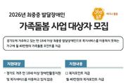 [경기탑뉴스=박봉석 기자] 경기도가 2026년 최중증 발달장애인 가족돌봄 사업 대상자 145가구를 12월 2일까지 모집한다. 최중증 발달장애인이란 도전적 행동이 심하고 일상생활에 제약을 지닌 통합돌봄이 필요한 발달장애인이다. 경기도는 돌봄이 필요한 모든 도민들을 대상으로 누구나, 언제나, 어디나 빈틈없는 돌봄을 제공하는 360도 돌봄사업을 하고 있다. 최중증 발달장애인 가족돌봄 사업은 이 가운데 ‘어디나 돌봄’ 사업의 하나로 진행한다. 2024년 4월 처음 가족돌봄 사업을 시행한 이래 매달 210가구에 월 40만 원씩 돌봄포인트를 제공해 생필품 구입부터 여가활동 지원까지 다양한 부분에서 사용하여 장애인 당사자와 가족의 생활안정에 기여하고 있다. 2026년 최중증 발달장애인 가족돌봄 사업의 지원 대상은 경기도에서 거주하는 복지관, 직업재활서비스 등 복지서비스 미이용으로 돌봄사각지대에 놓인 만 18세 이상 발달장애인이다. 선정 시 월 40만 원 가족돌봄포인트를 1년간 지원하고 지속적인 모니터링으로 복지서비스와 대상자를 연계하는 서비스를 제공한다. 2026년 모집인원은 145명으로 전년과 다르게 모집인원