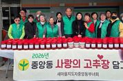 [경기탑뉴스=박봉석 기자] 오산시 중앙동은 지난 30일 새마을지도자 중앙동 부녀회가 지역 내 어려운 이웃을 위해 직접 담근 고추장 90통을 전달했다고 밝혔다. 이번 나눔은 새마을부녀회 회원들이 재료 준비부터 담그기까지 전 과정에 직접 참여해 정성을 더했으며, 관내 저소득층 가구에 전달되어 식생활 지원은 물론 이웃의 따뜻한 관심과 온기를 함께 전하는 계기가 될 것으로 기대된다. 중앙동 새마을부녀회는 매년 고추장과 삼계탕 등 다양한 먹거리 나눔 활동을 통해 이웃사랑을 실천하며 지역사회에 따뜻한 변화를 만들어가고 있다. 심옥자 중앙동 새마을부녀회장은 “회원들의 정성과 마음을 모아 준비한 만큼 이웃들에게 작은 힘이 되길 바란다”며 “앞으로도 지속적인 나눔 활동을 이어가겠다”고 말했다. 백경희 중앙동장은 “항상 이웃을 먼저 생각하며 실천해 주시는 새마을부녀회에 깊이 감사드린다”며 “소중한 나눔이 꼭 필요한 곳에 전달될 수 있도록 최선을 다하겠다”고 밝혔다.