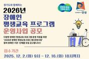 [경기탑뉴스=박봉석 기자] 안성시는 성인 장애인의 평생학습 권리를 보장하고 평생교육 참여 기회를 확대하기 위하여 경기도와 안성시가 함께 지원하는 '2026년 장애인 평생교육 프로그램 운영' 공모사업을 추진한다. 이번 공모사업은 성인 장애인을 위한 맞춤형 평생교육 프로그램을 발굴‧지원하여 사회참여 기회를 넓히고, 누구나 차별 없이 배움의 기회를 누릴 수 있는 평생학습 환경을 조성하는 데 목적이 있다. 신청 대상은 안성시에 주소(등록)를 둔 장애인 평생교육 기관‧단체이며, 신청 기간은 12월 2일부터 16일까지이다. 모집 규모는 ▲평생교육법 제7진 분류를 기반으로 한 ‘장애인 평생교육 프로그램’ 1개소와 ▲'장애인복지법'에 따른 15개 장애 유형 분류를 기반으로 한 ‘장애유형별 평생교육 프로그램’ 2개소, 총 3개소이다. 선정된 프로그램은 2026년 2월부터 10월까지 운영될 예정이다. 공모사업에 대한 자세한 내용은 안성시청 누리집 및 안성배움e 누리집에 게시된 공고문을 통해 확인할 수 있으며, 신청 서류 또한 해당 누리집에서 내려받을 수 있다. 시 관계자는 “이번 사업을 통해 성인 장애인의 평생학습