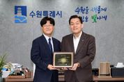 [경기탑뉴스=박봉석 기자] 미국 아리조나한인회 임애훈 한인회장이 25일 수원시청을 방문해 이재준 수원시장에게 감사패를 전달했다. 아리조나는 수원시의 국제자매도시인 피닉스시가 있는 주다. 아리조나주 한인회는 “2024년 피닉스시 방문을 인연으로, 한인회 주요 행사마다 축하 인사와 격려를 통한 이재준 시장님의 관심과 따뜻한 성원은 교민 사회 연대를 굳건히 하고, 조국에 대한 애국심을 고양하는 데 큰 힘이 됐다”며 “아리조나주 한인사회를 대표해 교민들 정성을 모아 존경과 감사의 마음을 전달한다”고 밝혔다. 수원시와 피닉스시는 2021년 10월 자매결연을 했다. 2024년 1월 피닉스시를 방문한 이재준 시장은 아리조나한인회와 함께 ‘아리조나 한국전 참전비’를 참배하고, 아리조나한인회와 간담회를 했다. 이날 간담회에는 한국전 참전용사 1명이 함께했다. 임애훈 회장은 이날 아리조나주 마크 켈리(Mark Kelly) 상원의원의 친서를 이재준 시장에게 전달했다. 마크 켈리 의원은 친서에서 “아리조나는 피닉스와 수원이 자매도시로서 쌓아온 굳건하고 변함없는 우정을 소중히 여기고 있다”며 “수원시의 지속적인 번영과 수